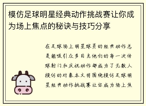 本文旨在展示足球明星的风采与个人成就,汇集了一系列精彩的介绍图片,通过这些图片,我们不仅能够感受到球员们在场上拼搏奋斗的激情,同时也能领略他们在生活中多姿多彩的一面。文章将从四个方面进行详细阐述:首先是足球明星的职业生涯,着重分析他们在赛场上的卓越表现;其次是个人成就,包括获得的奖项与荣誉;第三部分将探讨明星球员对社会及青少年的影响力;最后,将关注他们在场外的生活和个性魅力。通过这些内容,我们希望...